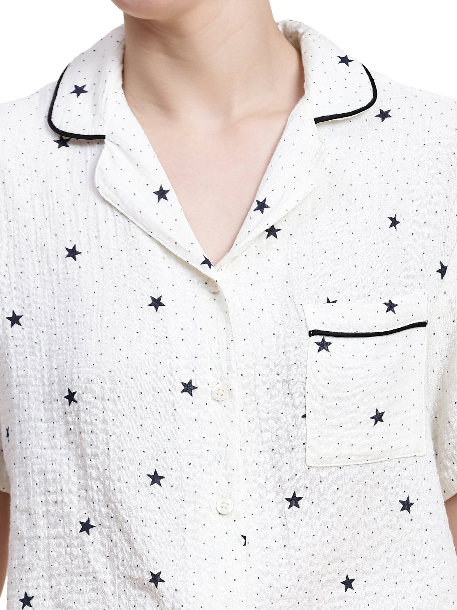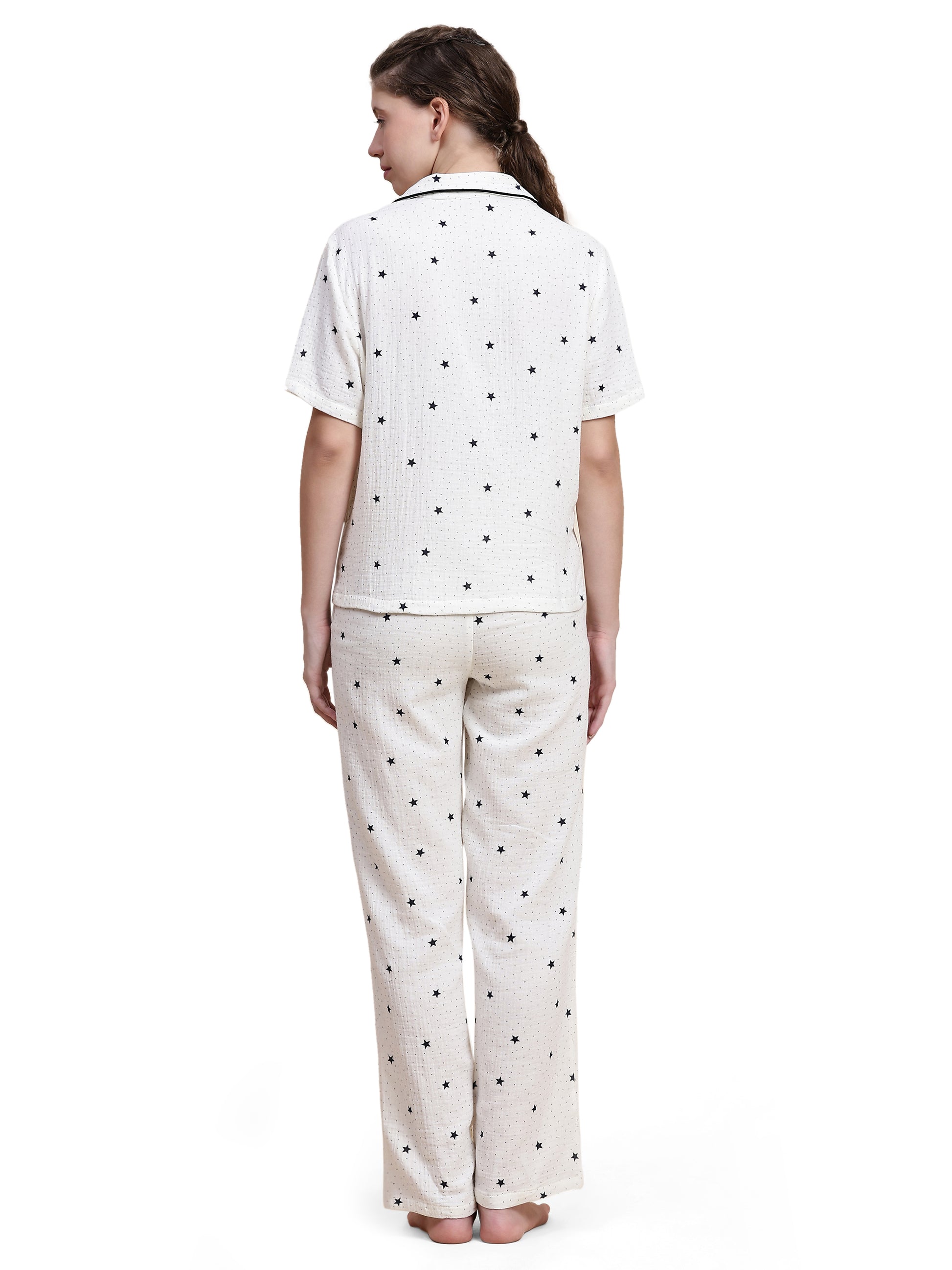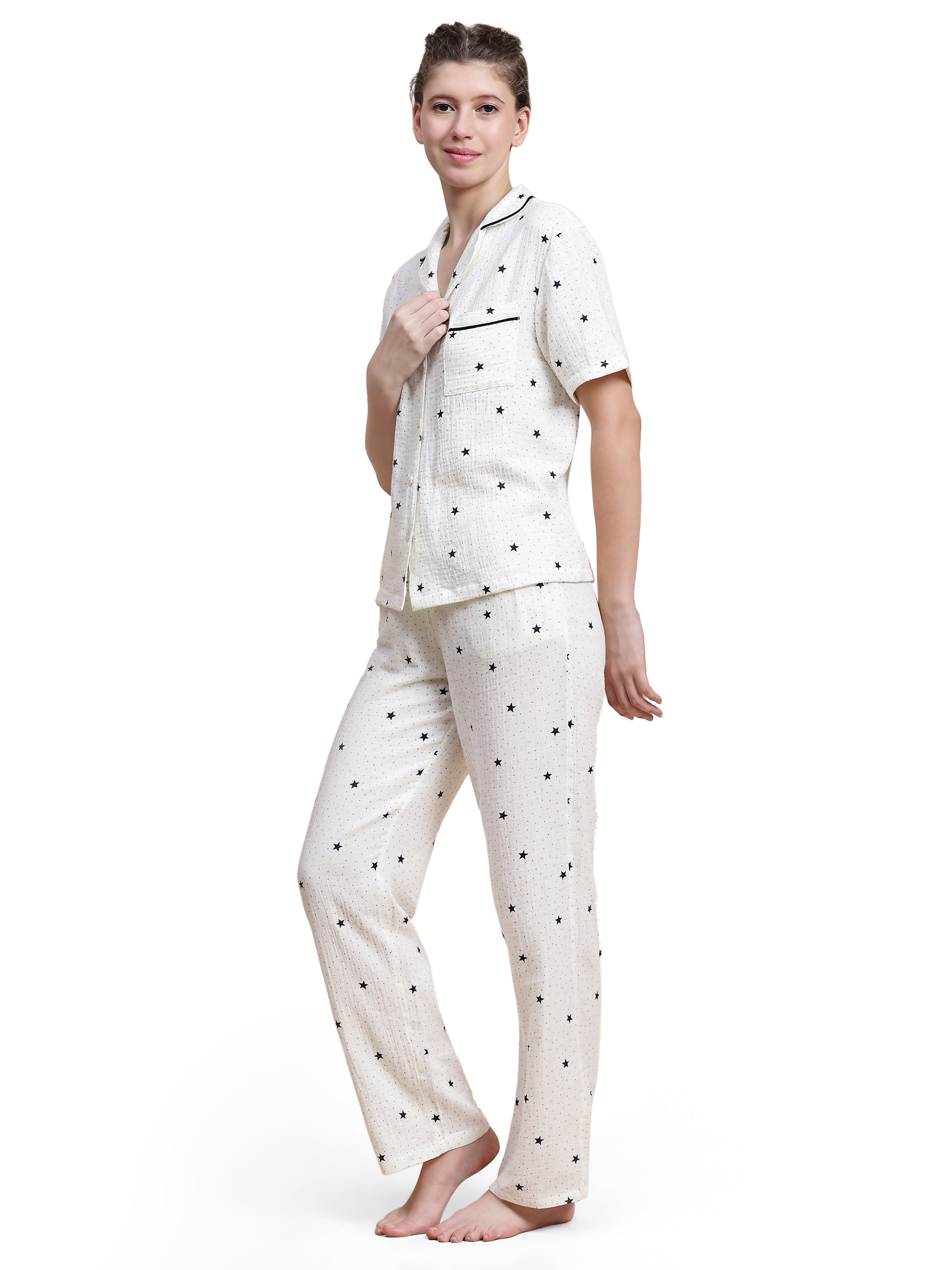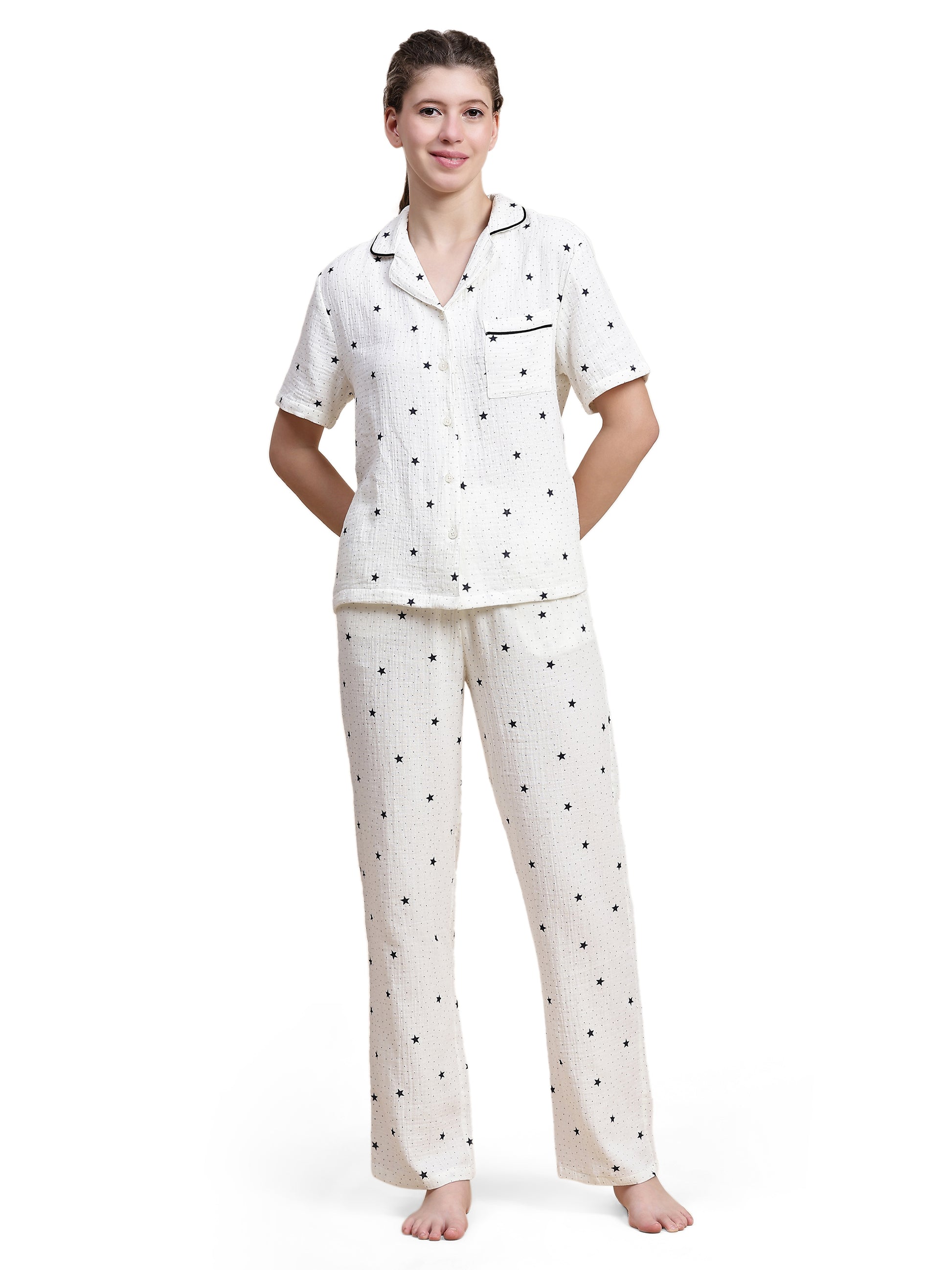 Adorned with a delicate, minimalist star motif, the set features a short-sleeve button-down with sharp black piping for a touch of "in-class" definition. Paired with our relaxed, wide-leg trousers, it offers an effortless silhouette that transitions beautifully from a midnight read to a slow morning. At Sheer Day, we believe your nighttime rituals deserve the same high-fashion integrity as your day, rooted entirely in the comfort of nature.